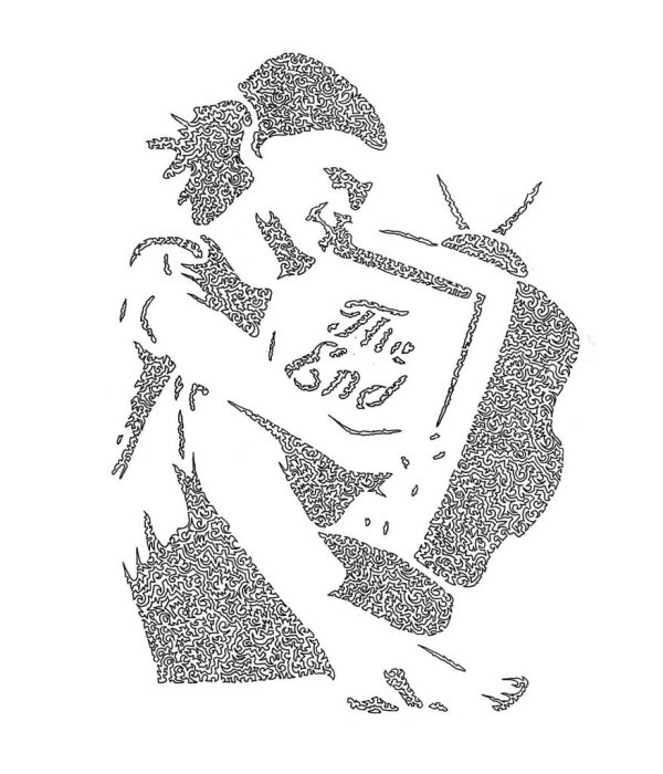 This particular piece was created as part of a 2018 exhibition, which took place in London. The work, which carries a powerful message, is a variation on a “shop window” display, with a sign that reads “The End.” It conveys themes of consumerism, capitalism, and the inevitability of collapse in modern society.